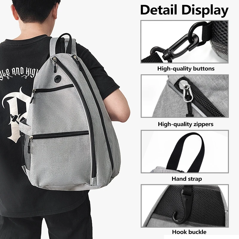 Built with high-quality materials, this sling bag stands up to daily use. The exterior fabric resists scuffs and light rain, keeping your items safe. Strong zippers and reinforced seams provide reliability. The strap is adjustable and cushioned for comfort, so wearing it across the shoulder feels natural whether you walk to the court or ride a bike. The bag’s shape balances well against the body, reducing bounce during movement